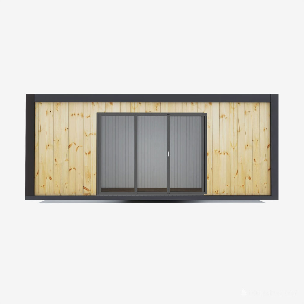 Pawilon ocieplany wykonany z płyt warstwowych styropianowych 100 mm o wymiarach 3 m x 6 m wysokość wewnątrz 2,54 m ze spadkiem na 2,44 m.